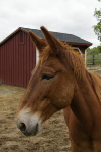 Channing is a 10 year old hinny. (The offspring of a male horse and a female donkey.) Channing loves people and he can be very enthusiastic. He will follow the volunteers around his paddock and ask for pats. Sometimes he doesn’t know his own size, and may be a bit too strong for young children to handle. He is working on it though, and is in training learning to respect space and work on his ground manners. He is doing excellent! He responds great to Clicker training (R+) as do most donkeys, hinnies and mules.