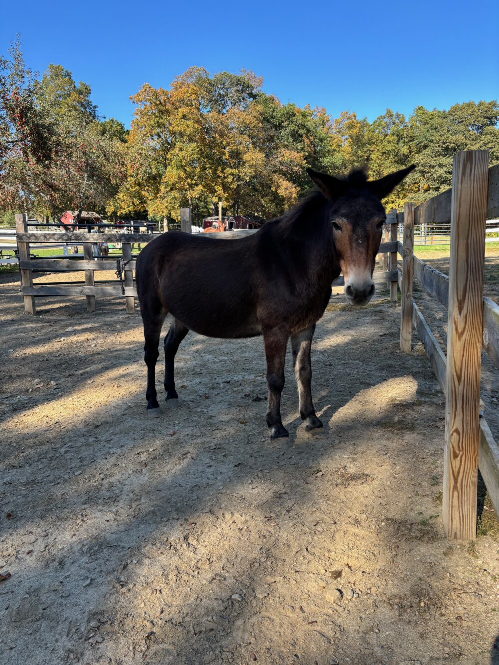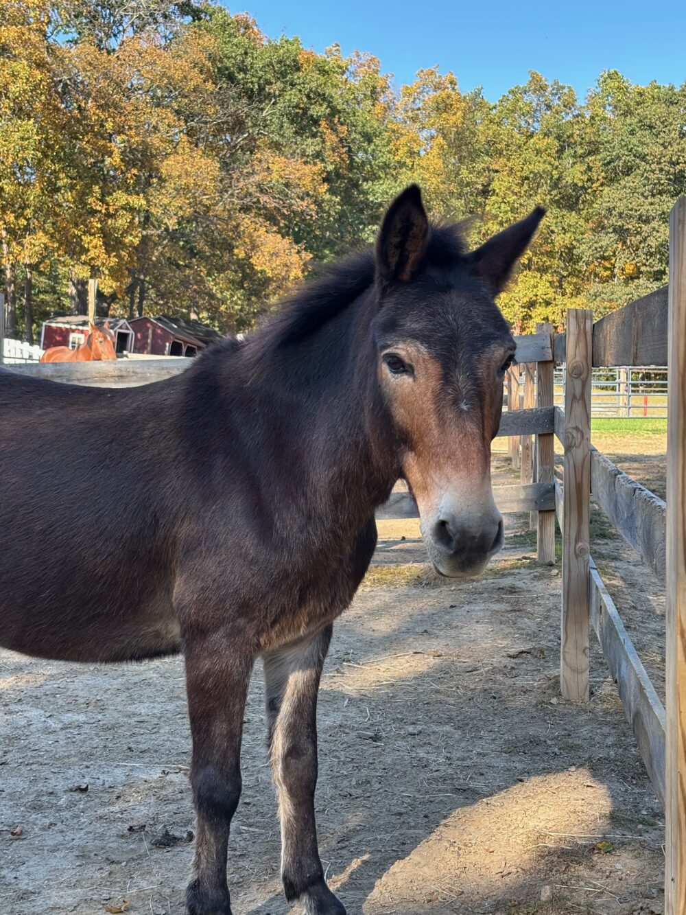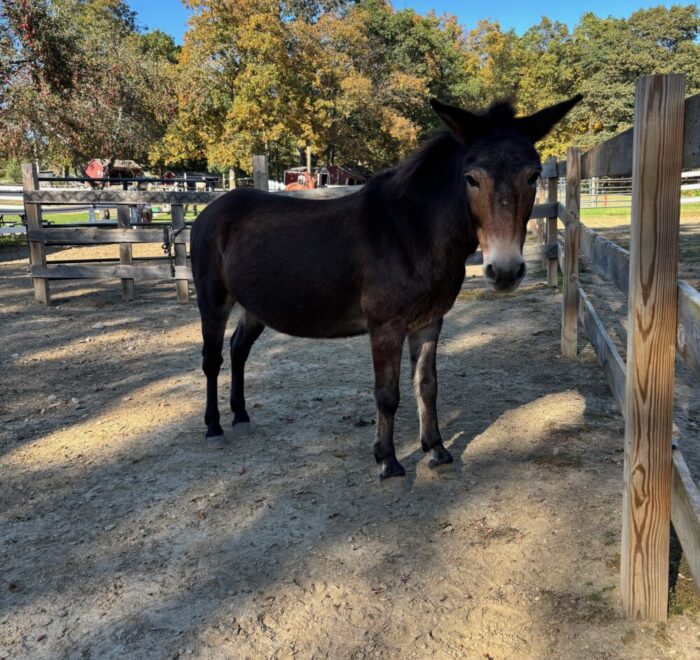 Henry is a good size mini mule. We do not have much background information about him. Our vet has yet to determine his age. He could be 16 or 26 and anything in between! He arrived with Tommy, our other mule, but they are not bonded and can go to separate homes. Henry is very smart and learning to trust humans and all the basics like haltering, leading, picking up his feet and so on. So far he has been very cooperative and very sweet, but sometimes a bit standoffish.