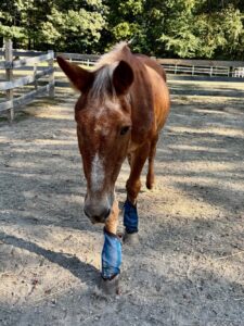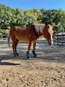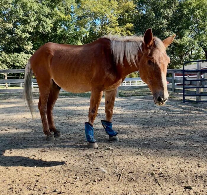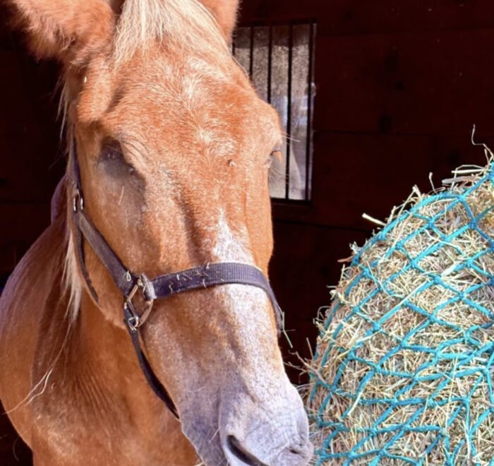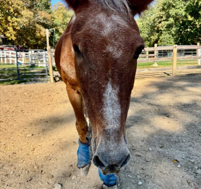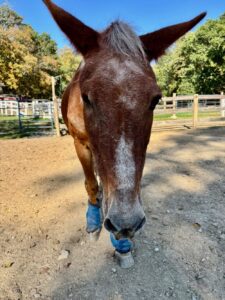 Tommy is a 25 year old one-eyed Standard Mule. Tommy was with NEER nearly ten years ago, and he has come back to us only because his owner could no longer care for him. He is very sweet and curious, and will follow the volunteers around the paddock and supervise their work. He hasn’t been handled a lot recently, and our trainer is working with him on ground manners and all the basics.